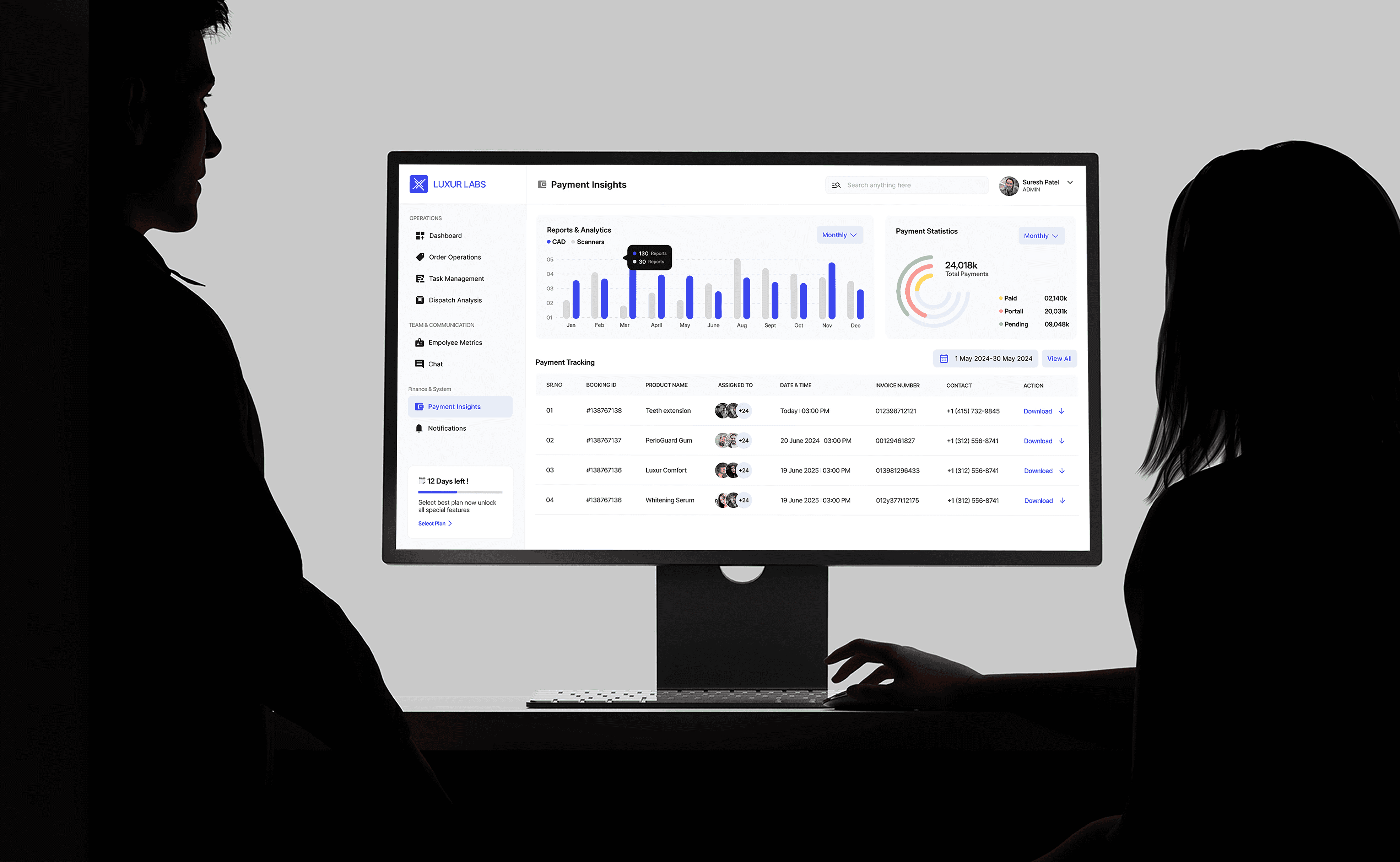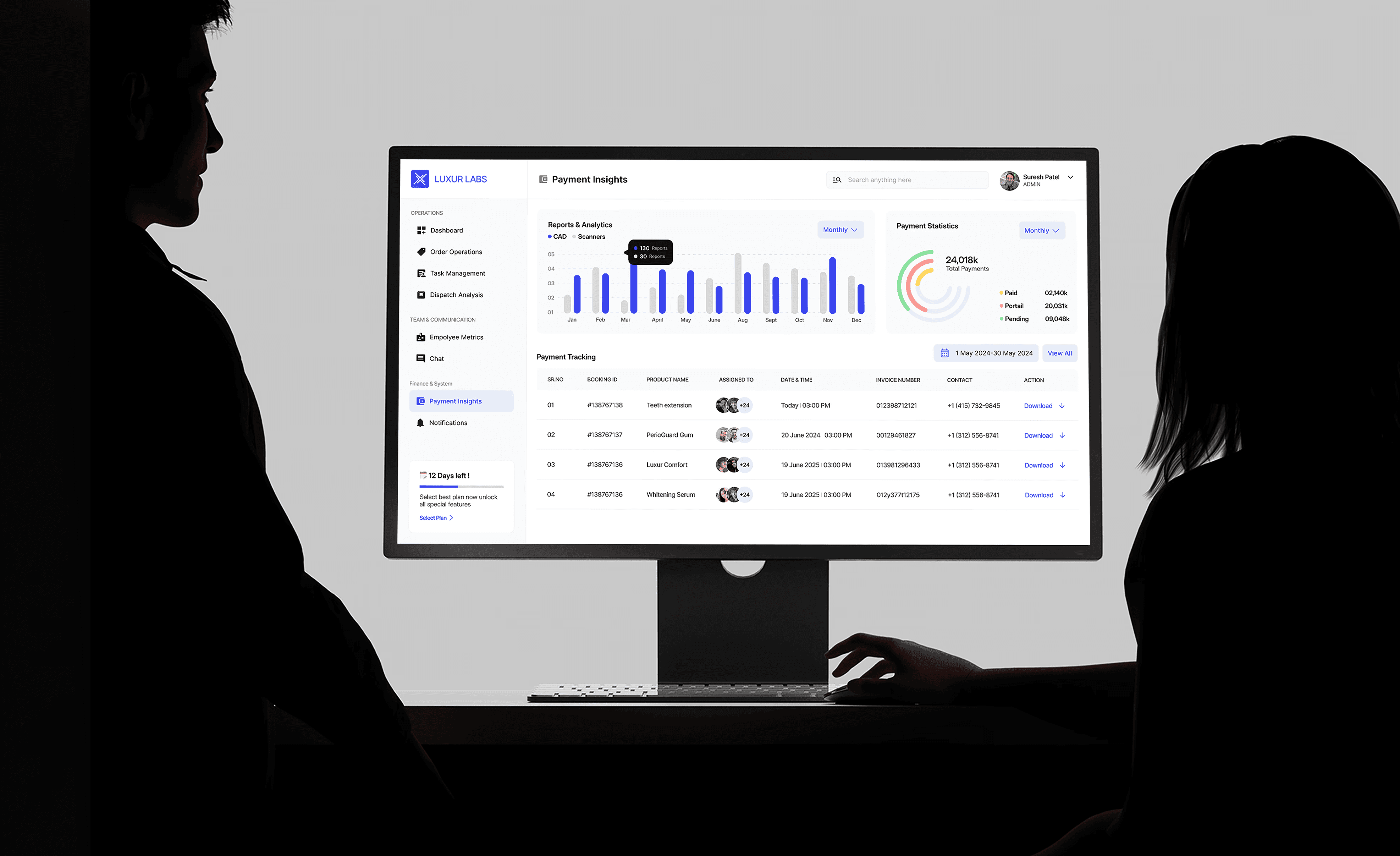 Luxur Labs partnered with us to completely reimagine the dental lab experience. By building a system that streamlines communication between dentists, technicians, quality checkers, and administrators, we helped transform a process traditionally bogged down by manual steps into a seamless digital workflow. The result is a platform that reduces errors, accelerates turnaround, and ensures patients receive the highest quality dental prosthetics.